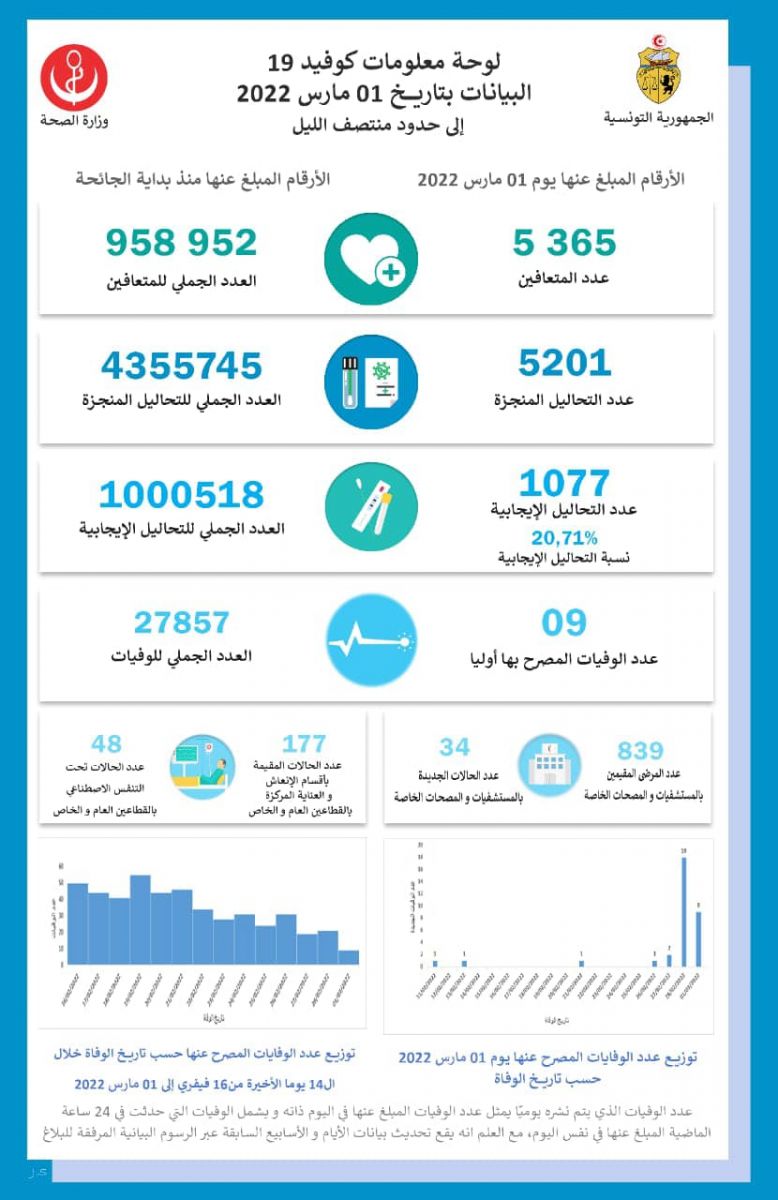 أعلنت وزارة الصحة اليوم الخميس 3 مارس 2022 أنه تم بتاريخ 1 مارس المنقضي تسجيل 9 حالات وفاة مصرح بها أوليا و1077 اصابة جديدة بفيروس كورونا ليرتفع بذلك عدد الوفيات والإصابات جراء كورونا على التوالي الى 27857 وفاة و1000518 إصابة منذ ظهور الوباء بالبلاد خلال شهر مارس من سنة 2020.