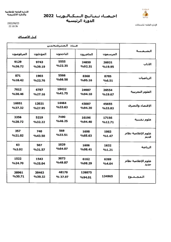 بلغت نسبة النجاح  في الدورة الرئيسية لامتحان البكالوريا 2022 لكل الأصناف 37.97 بالمائة ، أي 48178 تلميذا وتلميذة.