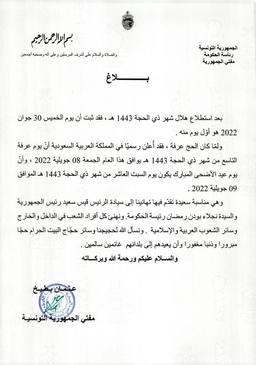 أعلن مفتي الجمهورية التونسية في بلاغ مساء اليوم الأربعاء 29 جوان 2022 أن يوم عيد الأضحى المبارك يكون يوم السبت 9 جويلية 2022 الموافق للعاشر من شهر ذي الحجة 1443 هـ..