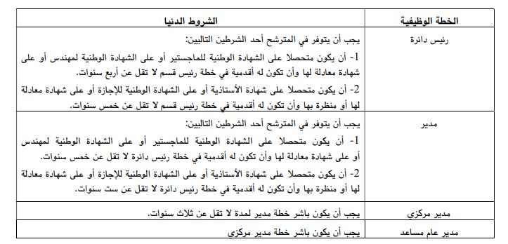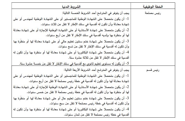 ـ يجب أن تتوفر في المترشح شروط الأقدمية (في سلك الإطار بالنسبة لرئيس مصلحة وفي الوظيفة الدنيا بالنسبة للخطط الوظيفية الأخرى) والمستوى التعليمي المضبوطة بالجدول التالي:
