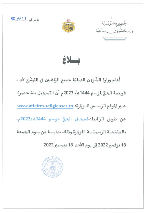 أكدت وزارة الشّؤون الدينيّة أنّ تسجيل الترشّح لأداء فريضة الحج لموسم 1444هـ/ 2023م ، يتمّ حصريّا عـبر الموقع الرّسمي للوزارة: www.affaires-religieuses.tn