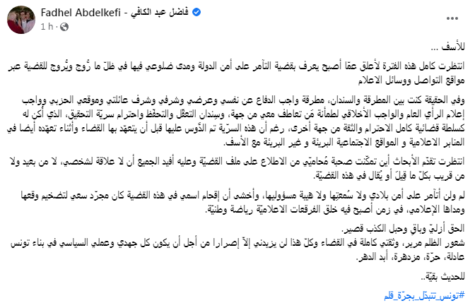 نشر فاضل عبد الكافي رئيس حزب آفاق تونس تدوينة عبر صفحته الرسمية على موقع التواصل الاجتماعي فايسبوك اليوم الجمعة 2 ديسمبر 2022، علّق فيها على ورود اسمه في قائمة ضمّت أكثر من عشرين شخصا تمّ إتهامهم في قضية تتعلّق بـ''التآمر على أمن الدولة ''، ومدى ضلوعه فيها في ظلّ ما رُّوج ويُّروج للقضية عبر مواقع التواصل ووسائل الاعلام ، وفق تعبيره.