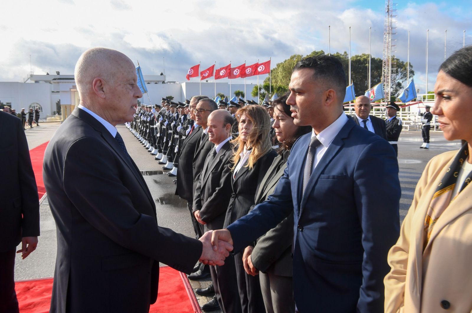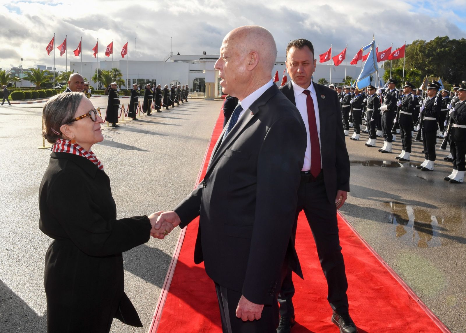 وكان في توديع رئيس الدولة نجلاء بودن رمضان، رئيسة الحكومة، وكمال الفقي، والي تونس، وسعاد عبد الرحيم، رئيسة بلدية تونس وأعضاء الديوان الرئاسي.