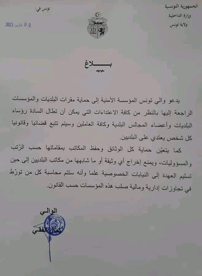 كما أكّد الوالي على أنّه يتعيّن حماية كلّ الوثائق وحفظ المكاتب بمقاماتها حسب الرتب والمسؤوليات، مشيرا إلى أنّه يُمنع إخراج أيّ وثيقة أو ما شابهها من مكاتب البلديين إلى حين تسليم العهدة إلى النيابات الخصوصة "علما وأنّه سيتم محاسبة كلّ من تورّط في تجاوزات إدارية ومالية صلب هذه المؤسسة"، حسب ما ورد في البلاغ.