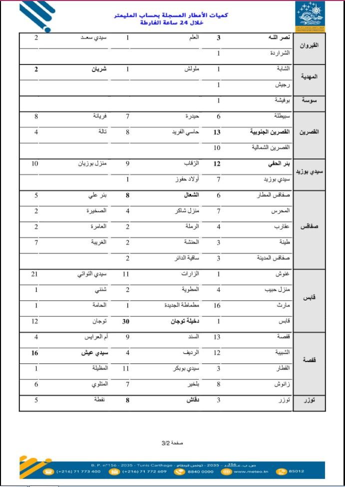 وفيما يلي كميات الامطار المسجلة بحساب الميلمتر وحسب الولايات: