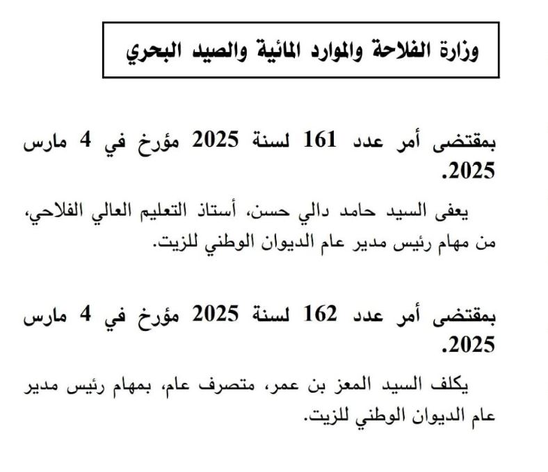 صدر بالرائد الرسمي للجمهورية التونسية أمر عدد 161 مؤرخ في 4 مارس 2025 يقضي بإعفاء حامد دالي حسن الرئيس المدير العام للديوان الوطني للزيت من مهامه. وتم بمقتضى أمر عدد 162 تكليف المعز بن عمر خلفا له.