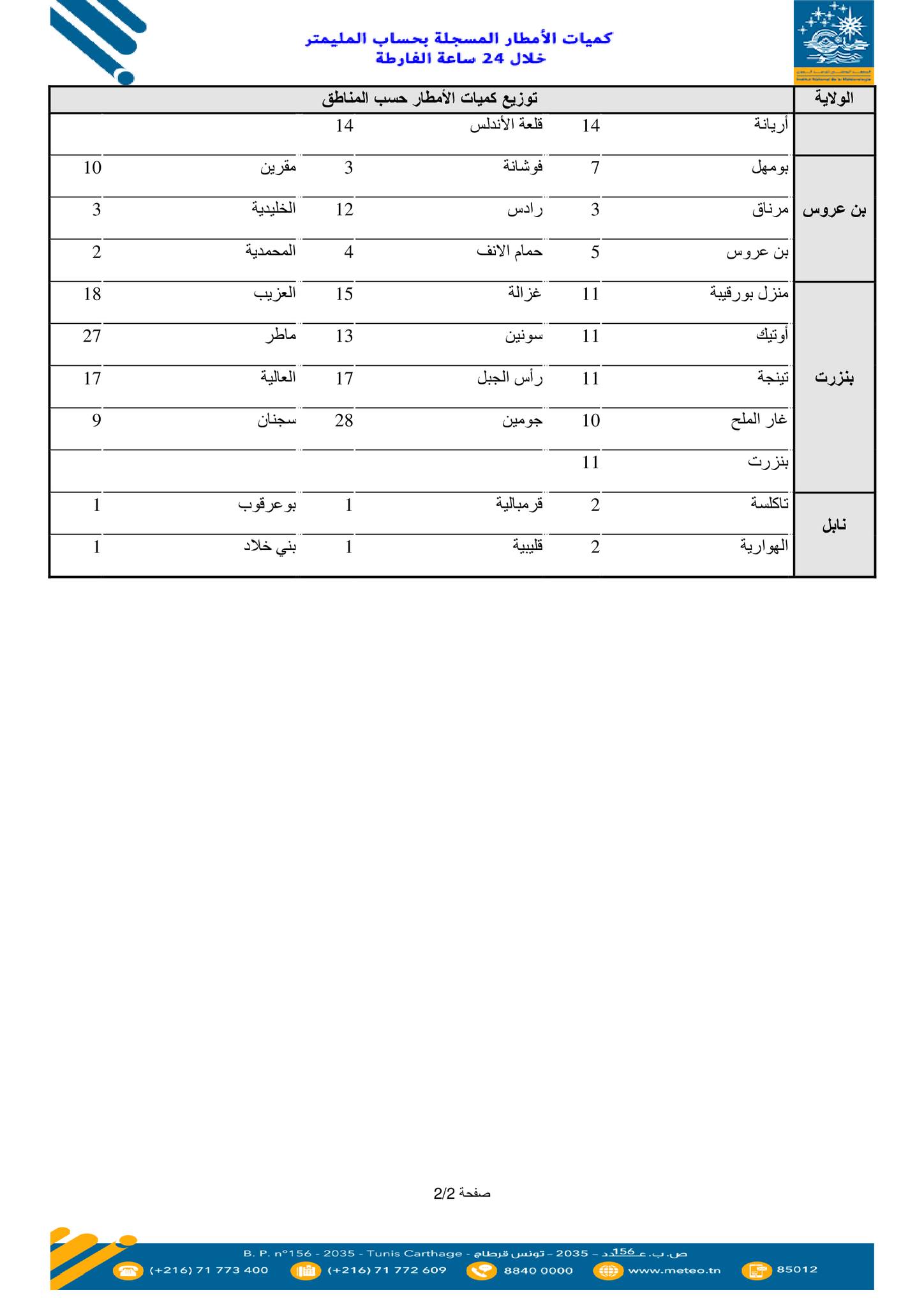 ونشر المعهد الوطني للرصد الجوية قائمة أوّلية بكميات الأمطار المسجلة من الساعة 07:00 ليوم أمس الاربعاء إلى الساعة 07:00 لليوم الخميس.