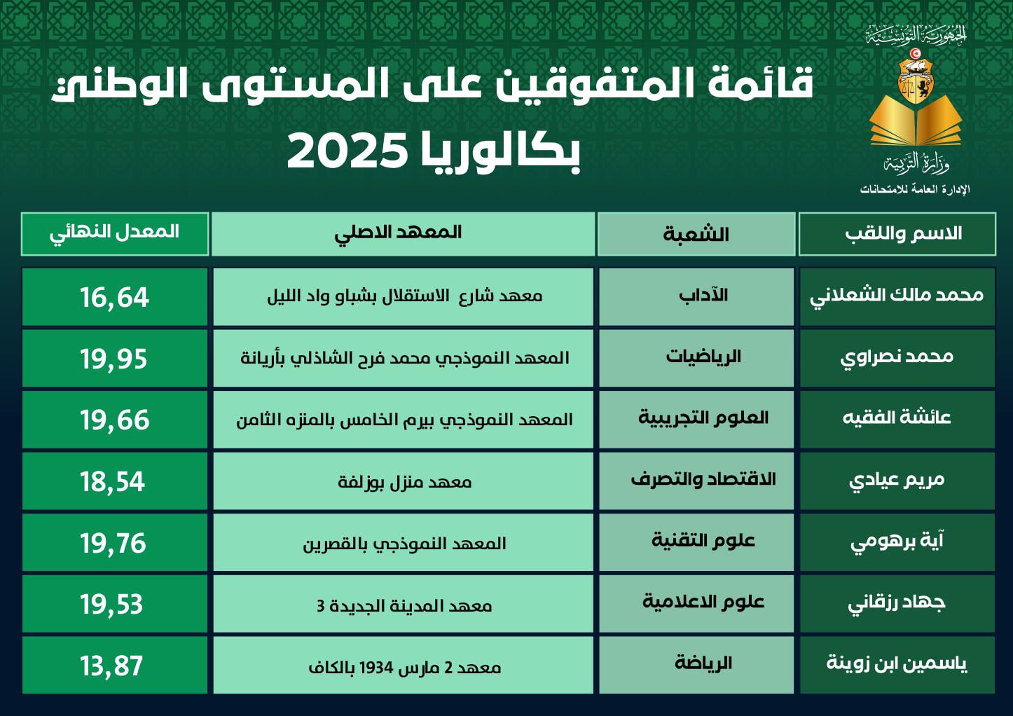 قائمة المتفوّقين على المستوى الوطني / بكالوريا 2025