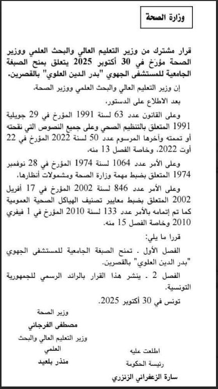 مُنحت الصبغة الجامعية للمستشفى الجهوي بدر الدين العلوي بالقصرين، بقرار نشر في الرائد الرسمي، بتاريخ الخميس 30 أكتوبر 2025.