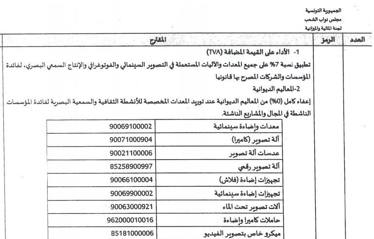 وذلك بتطبيق نسبة 7٪ كأداء على القيمة المضافة على المعدات المستعملة في التصوير السينمائي والفوتوغرافي والإنتاج السمعي البصري لفائدة المؤسّسات والشركات المصرح بها قانونيا مع الإعفاء التام من المعاليم الديوانية عند توريدها. وتم ضبط هذه المعدات في جدول يحدد طبيعتها.