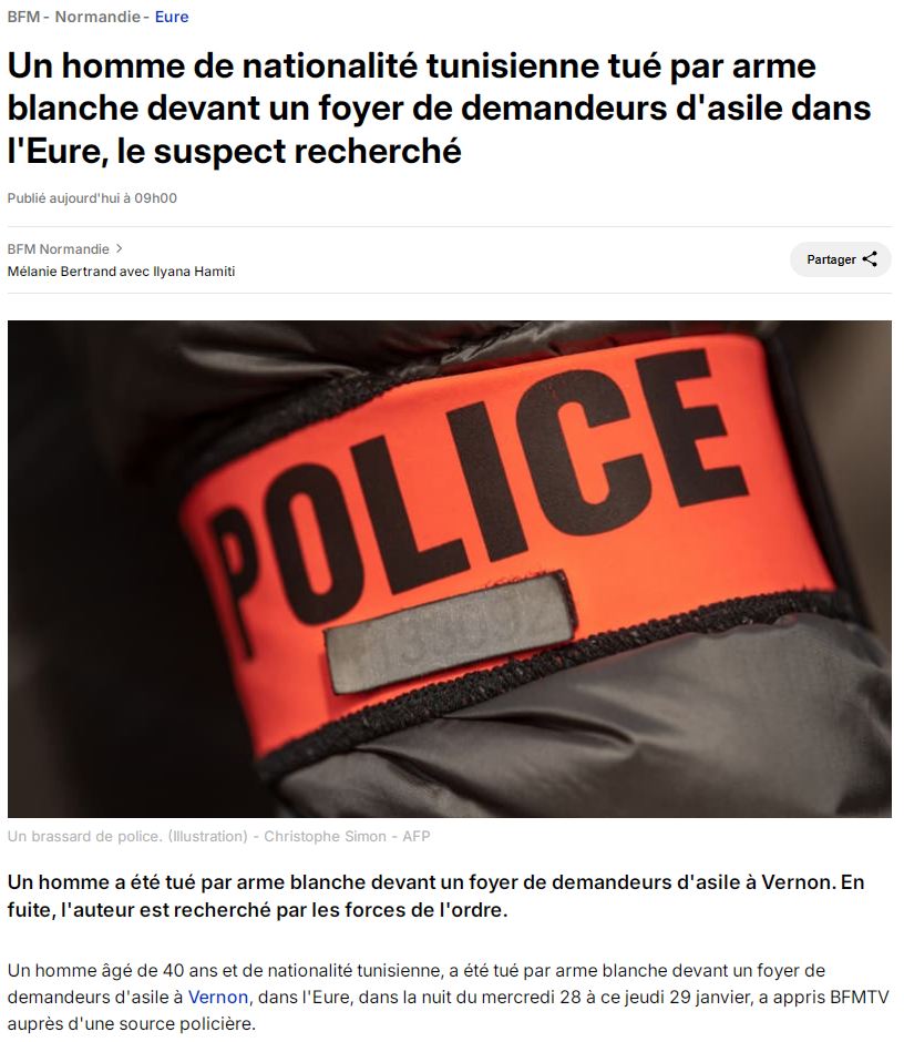 أكّدت قناة "بي أف أم" الفرنسيّة، نقلًا عن مصدر أمني، مقتل رجل يحمل الجنسية التونسيّة، الليلة المنقضيّة، إثر تعرّضه إلى عملية طعن بسلاح أبيض أمام مركز لإيواء طالبي اللجوء في مدينة فيرنون الفرنسيّة.