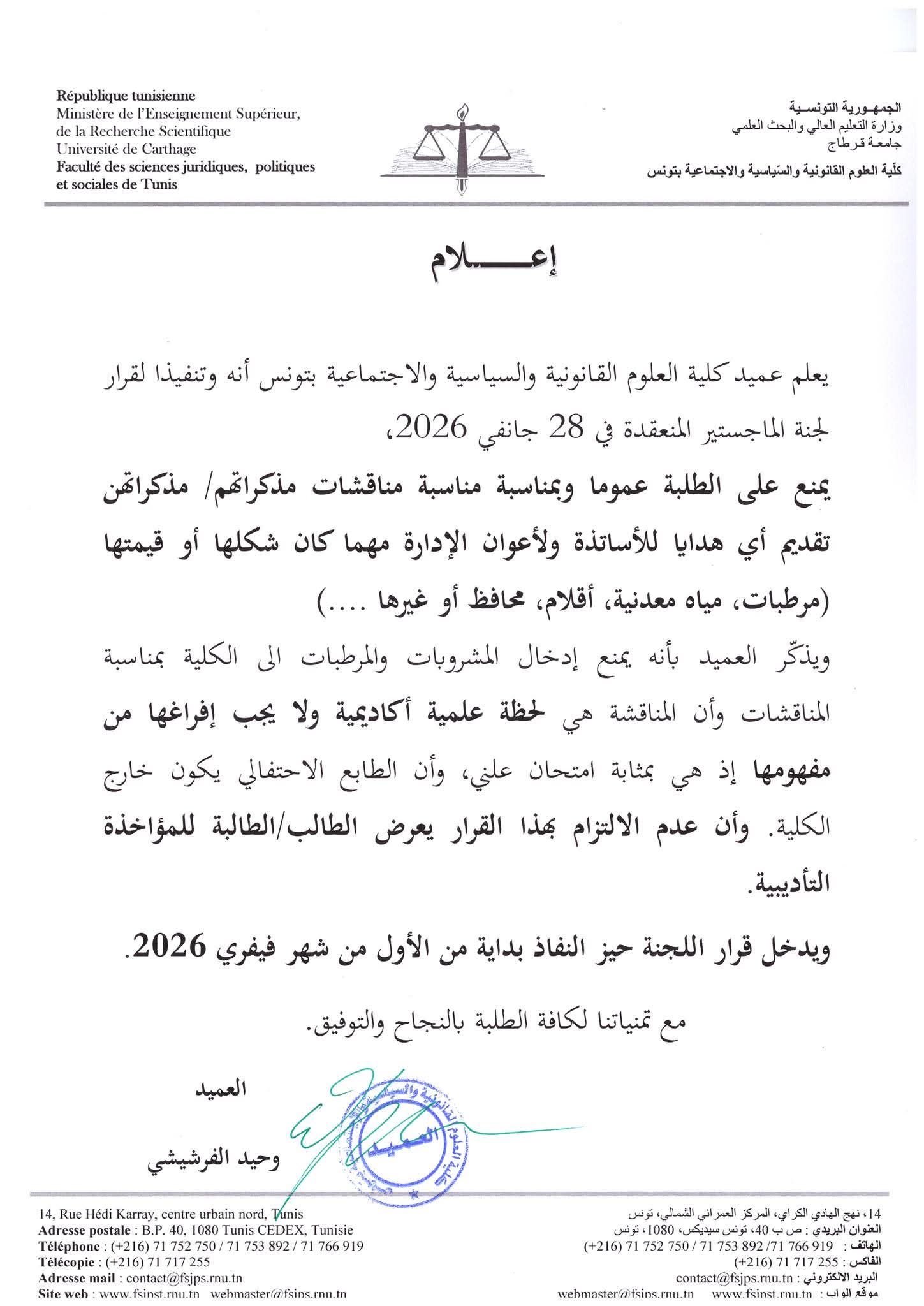 أعلنت كلية العلوم القانونية والسياسية والاجتماعية بتونس، في بلاغ لها، الخميس 29 جانفي 2026، عن منع تقديم الهدايا للأساتذة وأعوان الإدارة مهما كان شكلها أو قيمتها(مرطبات، مياه معدنية، أقلام...)، بمناسبة مناقشات الطلبة لمذكراتهم، كما ذكّرت بمنع إدخال المشروبات والمرطبات للكلية بمناسبة المناقشات.