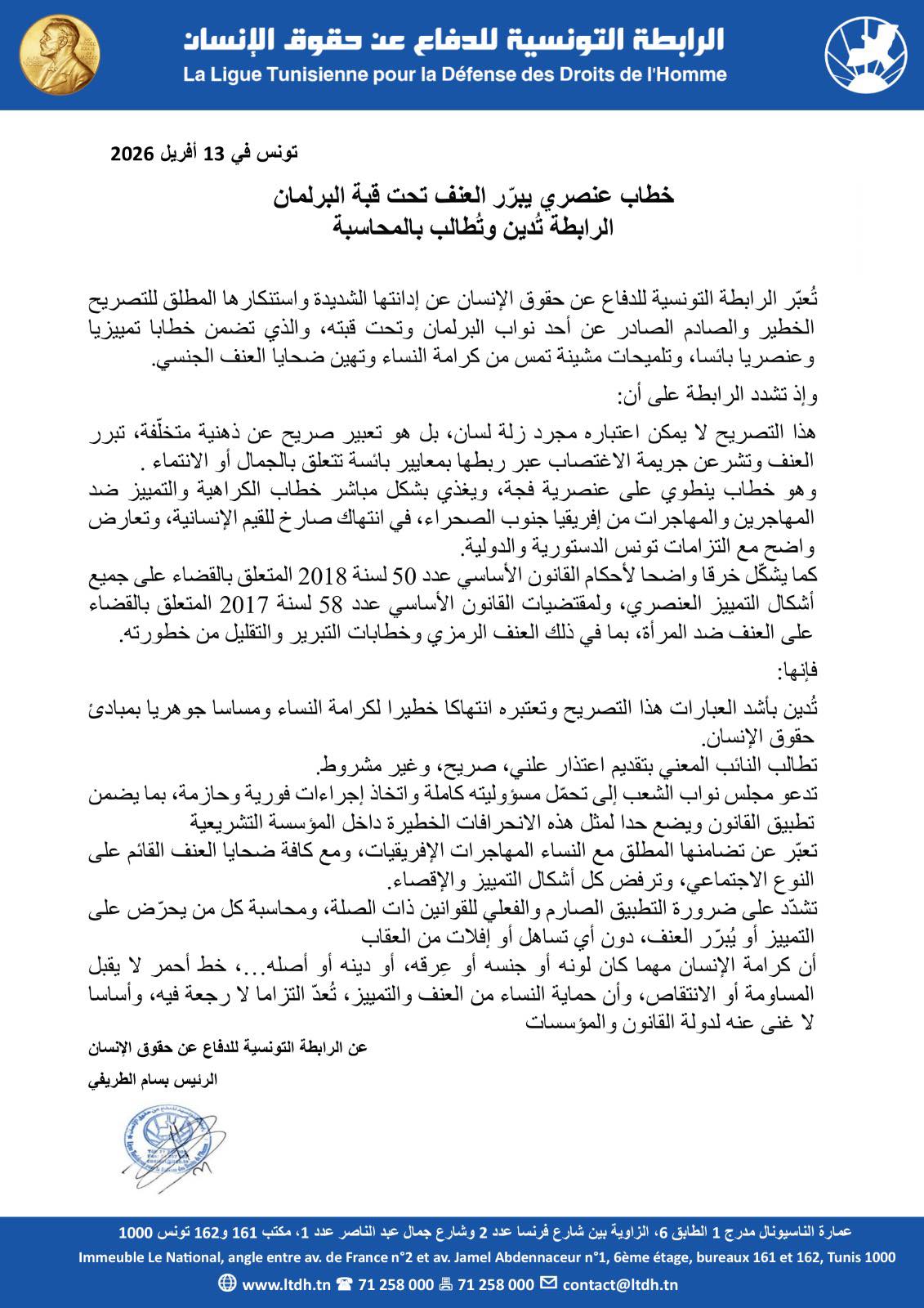 استنكرت الرابطة التونسية للدفاع عن حقوق الإنسان في بيان تصريحات أدلى بها أحد النائب طارق المهدي خلال جلسة عامة، معتبرة أنها تضمنت مضامين وصفتها بـ"التمييزية والمسيئة لكرامة النساء"، إلى جانب إشارات اعتبرتها "غير لائقة" تجاه ضحايا العنف الجنسي.