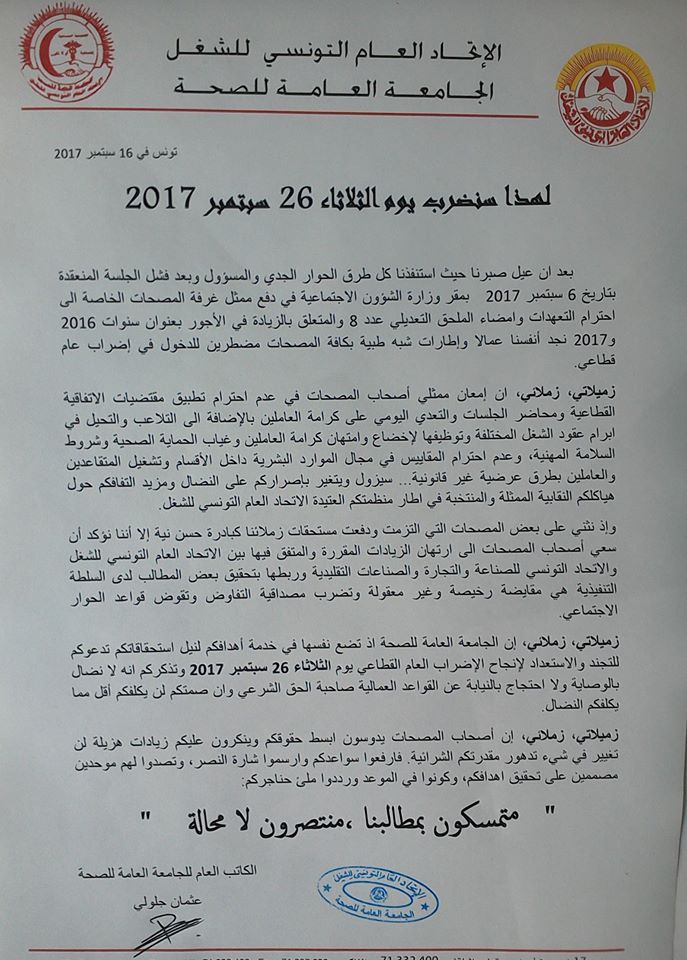تمّ الإبقاء على يوم 26 سبتمبر 2017 موعدا للإضراب العام القطاعي في المصحات الخاصة بدعوة من الجامعة العامة للصحة باتحاد الشغل.