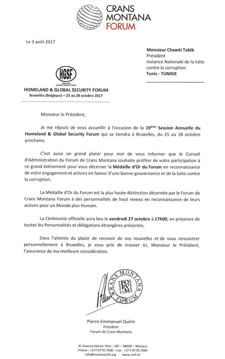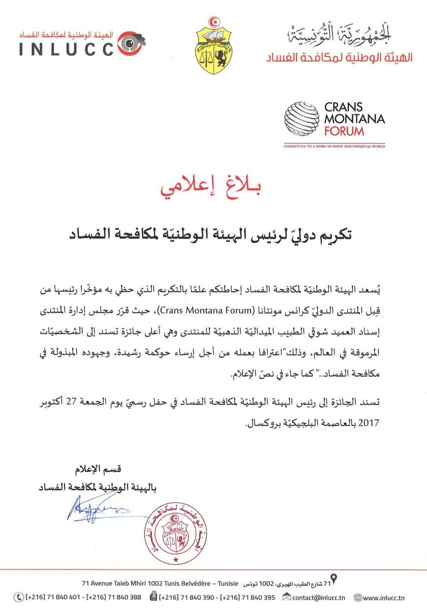 تحصل رئيس الهيئة الوطنية لمكافحة الفساد شوقي الطبيب على الميدالية الذهبية لمنتدى كرانس مونتانا لسنة 2017 اعترافا لعمله من اجل إرساء حوكمة رشيدة وجهوده المبذولة في مكافحة الفساد.