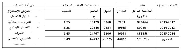 وكشفت حوصلة لعدد حالات العنف ونسبها المسجلة بالمرحلة الإعدادية والتعليم الثانوي خلال 3 سنوات من 2012 إلى حدود 2015، تسجيل 44.187 حالة في الإعدادي و23.225 في الثانوي.