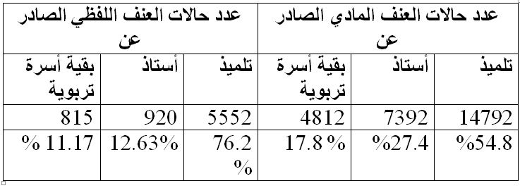 وفي ما يتعلق بحالات العنف اللفظي، تم تسجيل 5552 حالة في صفوف التلاميذ و920 حالة في صفوف الأساتذة و815 من طرف بقية الأسرة التربوية.