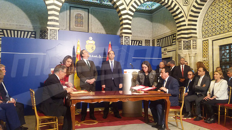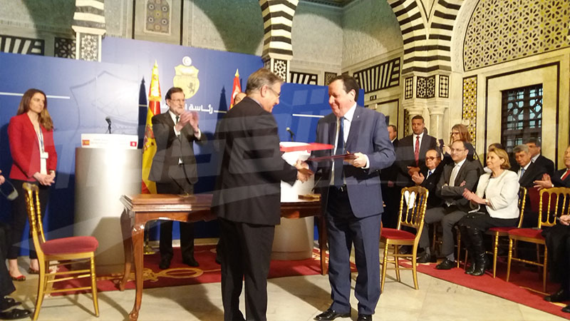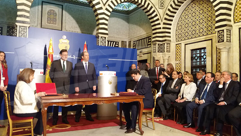 تم خلال اللقاء الصحفي المشترك في قصر الحكومة بالقصبة بين رئيس الحكومة يوسف الشاهد و نظيره الاسباني ماريانو راخوي،توقيع 8 اتفاقيات ومذكرات تفاهم في المجال الأمني ومكافحة الجريمة ومجالات التعليم العالي والبحث العلمي والتكوين المهني والفلاحة واتفاق لمكافحة العنف ضد المرأة واتفاق تعاون فني في مجال الحماية المدنية واتفاق بين مركز النهوض بالصادرات التونسي ونظيره الاسباني.