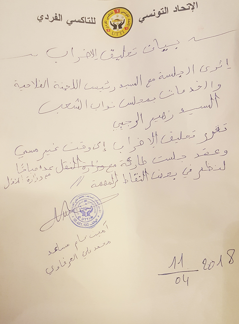 قرر الإتحاد التونسي للتاكسي الفردي تعليق الاضراب إلى تاريخ غير مسمى وعقد جلسة طارئة مع وزارة النقل للنظر في عدد من النقاط المهمة، وفق بيان للاتحاد تحصلت موزاييك على نسخة منه، ووقعه الأمين العام المساعد للاتحاد محمد علي العرفاوي.