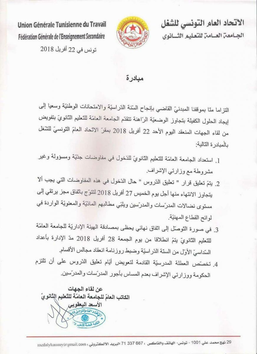 وأضاف انه في صورة التوصل إلى اتفاق نهائي يحظى بمصادقة الهيئة الإدارية القطاعية للتعليم الثانوي، سيتم انطلاقا من يوم الجمعة 27 فريل 2018 مد الإدارة بأعداد السداسي الأول من السنة الدراسية وضبط رزنامة انعقاد مجالس الأقسام، مؤكدا انه تقرر أيضا في إطار هذه المبادرة ان يتم تخصيص العطلة المدرسية القادمة لتعويض أيام تعليق الدروس على أن تلتزم الحكومة ووزارتا الإشراف بعدم خصم أجور المدرسين على خلفية الإضراب.