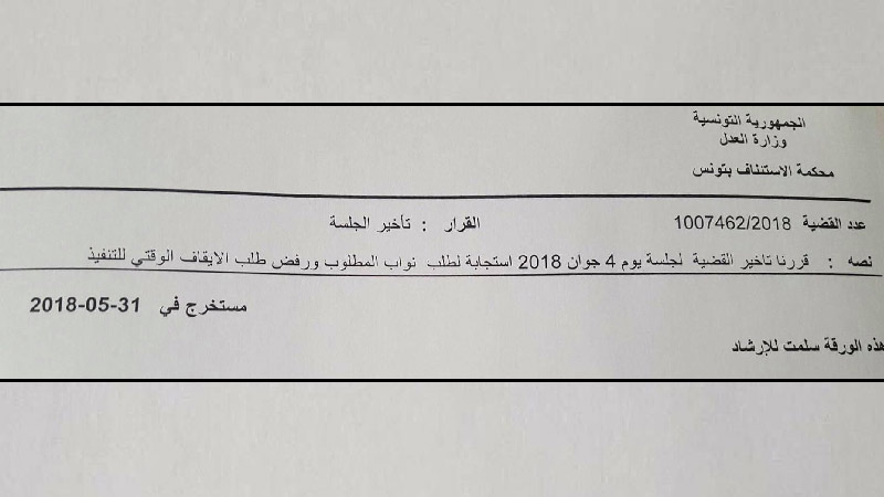 وقرّر الرئيس الأول للمحكمة تأخير النظر في المطلب الأصلي إلى جلية قادمة ستنعقد يوم 4 جوان 2018 بمقر محكمة الاستئناف بتونس.