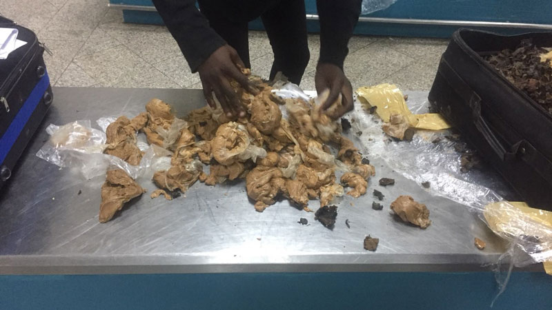 وأثبتت التحريات معه أنّه قد تمّ تكليفه من بعض معارفه بكينشاسا بقصد إيصال هذه البضاعة إلى فتاة كنغوليّة تقيم بتونس  فتمّ نصب كمين لهذه الأخيرة و تمّ القبض عليها ببهو المطار صحبة مواطنين من نفس جنسيّتها و تبعا لذلك تمّ التنسيق مع إدارة الأبحاث الديوانية قصد التعهد بمواصلة التحقيق في القضية.