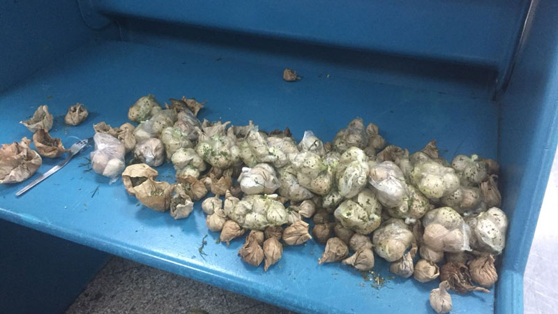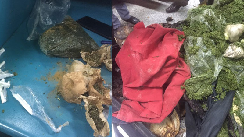 و بتفكيك أكياس الأطعمة و الطحالب التي كانت تملأ حقائب المسافر تمّ ضبط لفائف ورقية صغيرة تحتوي على حشائش خضراء اللون يشتبه في كونها مخدّر الماريخوانا تزن جمليّا 1.6 كلغ و لفائف أخرى تحتوي على مسحوق أبيض اللون يشتبه في كونه مخدّر الكوكايين تزن جمليّا 96 غرام.