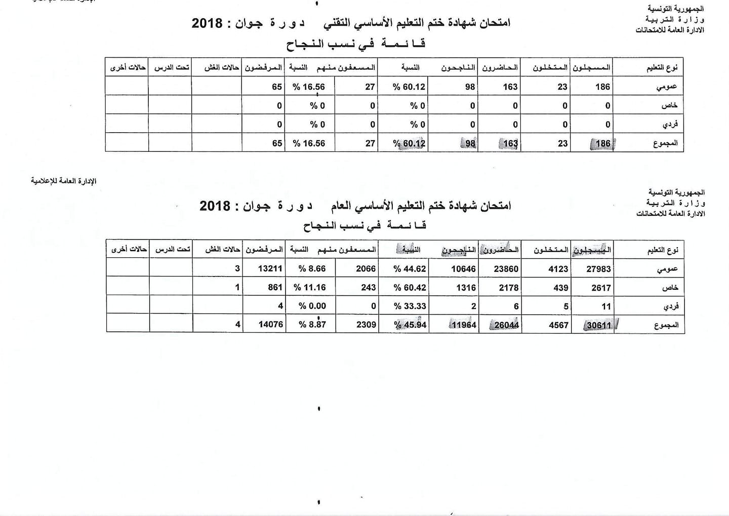 نشرت وزارة التربية على صفحتها على الفايسبوك قائمة في نسب النجاح في امتحان شهادة ختم التعليم الأساسي التقني دورة جوان 2018.