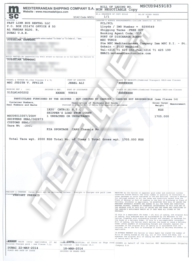 وتظهر الوثيقة أن ثمن السيارة يبلغ 13 ألف و800 دولار أمريكي أي ما يقارب 30 ألف دينار تونسي، وهي سيارة مستعملة استوجب اصلاحها 4 آلاف دينار وفق ما أكّده والدها.