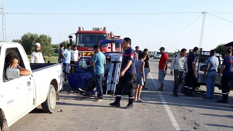 توفي 5 أشخاص من بينهم اعائلة بأكملها تتكون من الاب والام وابنتيهما في حادث اصطدام سيارتين على الطريق الجهوية عدد 2 الرابطة بين معتمدتي الشراردة وبوحجلة.