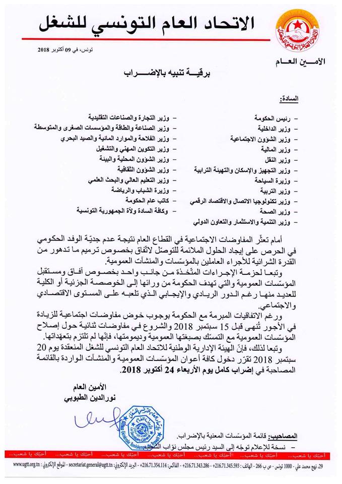 أصدر الإتحاد العام التونسي للشغل اليوم الثلاثاء، برقية تنبيه بالإضراب العام الذي أقرّته الهيئة الإدارية الوطنية، بكافة المنشآت والمؤسسات العمومية المقرر يوم الأربعاء 24 أكتوبر 2018.