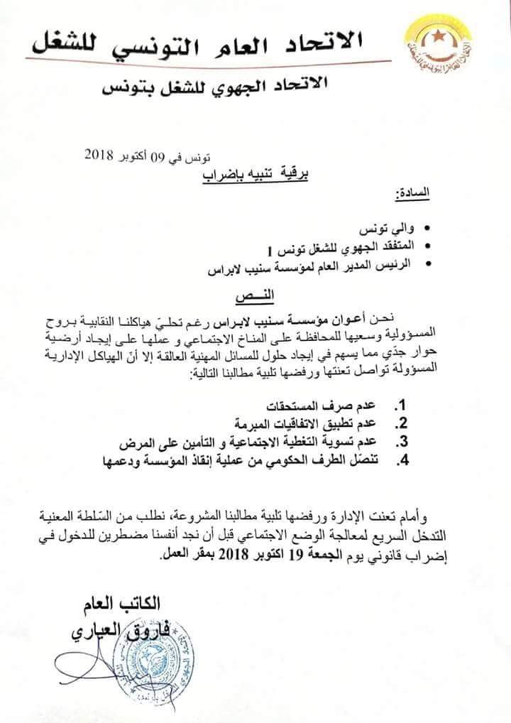 أفاد الاتحاد الجهوي للشغل في برقية تنبيه بإضراب موجهة إلى والي تونس والمتفقد الجهوي للشغل تونس 1 والرئيس المدير العام لمؤسسة سنيب لابراس أن أعوان المؤسسة سيدخلون في إضراب يوم الجمعة 19 أكتوبر 2018 بمقر العمل إثر ما اعتبروه تعنت الإدارة ورفضها تلبية مطالبهم المشروعة.