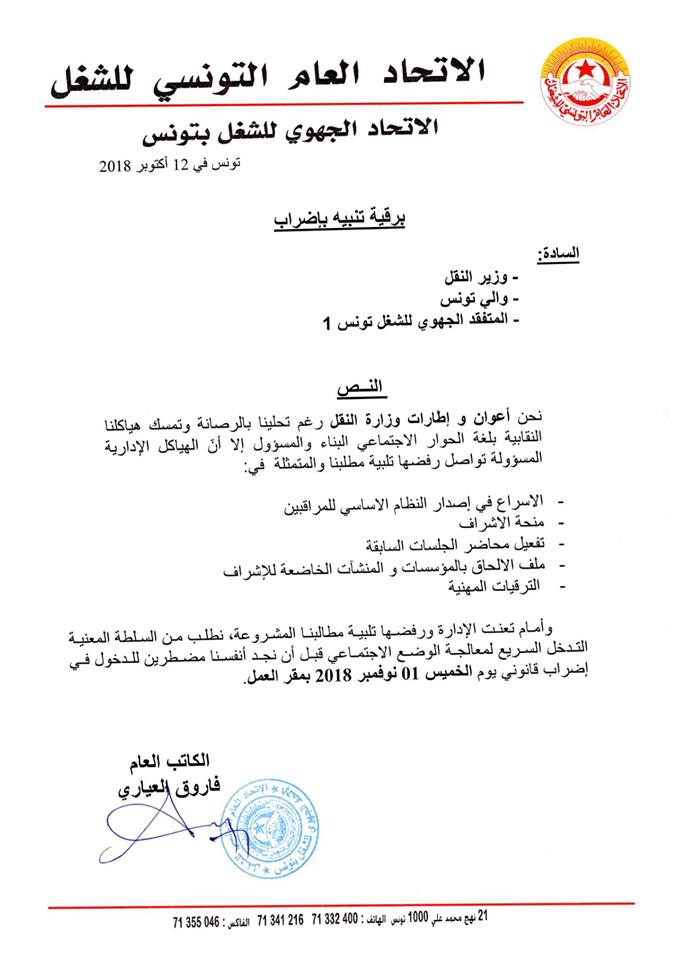 يدخل أعوان وزارة النقل واطاراتها في  اضراب حضوري عن العمل اليوم الخميس 1 نوفمبر 2018، على خلفية ما اعتبروه تعنّت الهياكل الادارية المسؤولة ورفضها الاستجابة لمطالبهم المهنية والاجتماعية ، حسب ما صرّح به كاتب عام النقابة الأساسية لاعوان وزارة النقل واطاراتها باتحاد الشغل وليد الكرعاني لموزاييك.