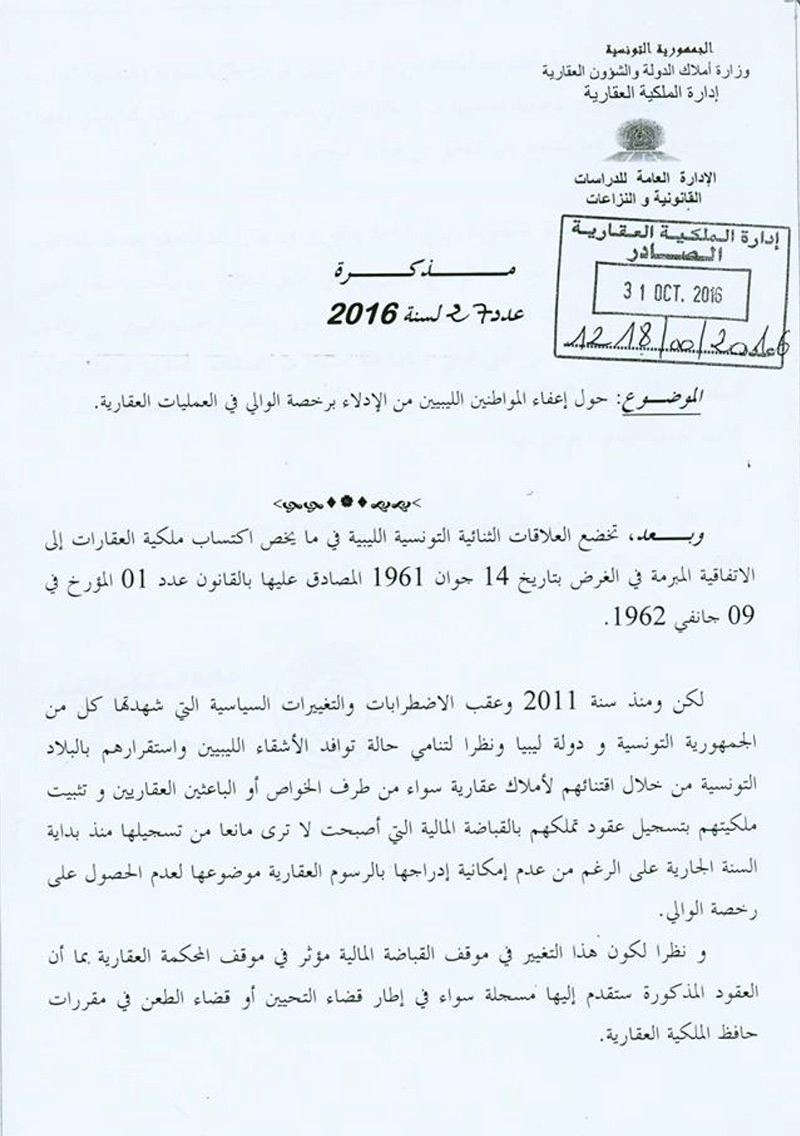 أكّد حافظ الملكية العقارية جمال العياري في تصريح لموزاييك الجمعة 2 نوفمبر 2016 اصدار مذكرة حول إعفاء المواطنين الليبيين من الإدلاء برخصة الوالي في العمليات العقارية على أن لا يشمل هذا الإعفاء العقارات ذات الصبغة الفلاحية .