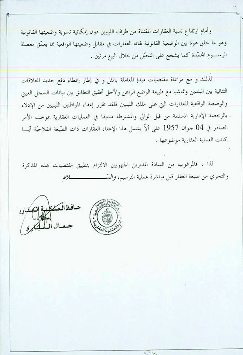 وأشار إلى أن هذه المذكّرة تتنزل في إطار عمل ترتيبي لتنفيذ اتفاقية، مبينا أنه كان في السابق يتم رفض تسجيل عقود شراء العقارات غير الفلاحية لليبيين بالقباضة المالية لكن وزارة المالية اتخذت قرارا منذ بداية السنة الحالية يقضي بتسجيل هذه العقود واستخلاص 6% كمعلوم عن كل عملية بيع، و5 بالمائة لفائدة الدولة و1 بالمائة معاليم إدارة الملكية العقارية.