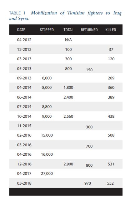 حسب دراسة لمعهد واشنطن لدراسة الشرق الأدنى بعنوان "المقاتلون الأجانب التونسيون في العراق وسوريا"، فإن عدد الإرهابيين التونسيين الذين قتلوا في بؤر التوتر منذ 2012 إلى بداية 2013، بلغ 3204 إرهابيا، فيما وصل 10860 إرهابيا مقاتلا إلى العراق وسوريا، عاد منهم إلى تونس 2720 مقاتلا إلى حدود مارس 2018.