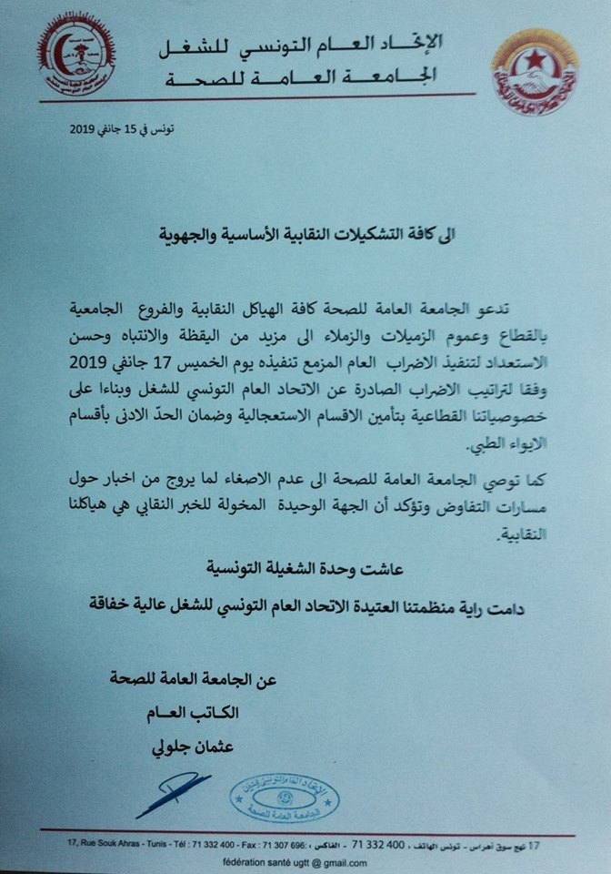 دعت الجامعة العامة للصحة كافة الهياكل النقابية والفروع الجامعية بالقطاع للاستعداد لتنفيذ الإضراب العام المزمع تنفيذه يوم الخميس 17 جانفي 2019، وفقا لتراتيب التي أعلن عنها الاتحاد العام التونسي للشغل مع مرعاة خصوصيات القطاع بتأمين الأقسام الاستعجالية وضمان الحدّ الأدنى بأقسام الإيواء الطبي.