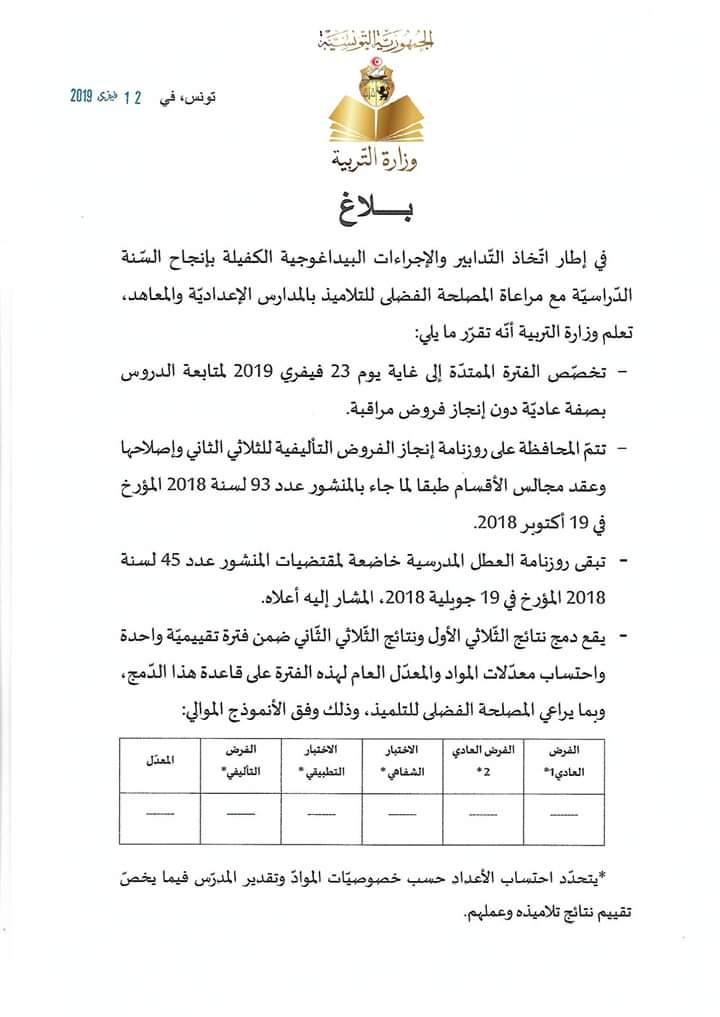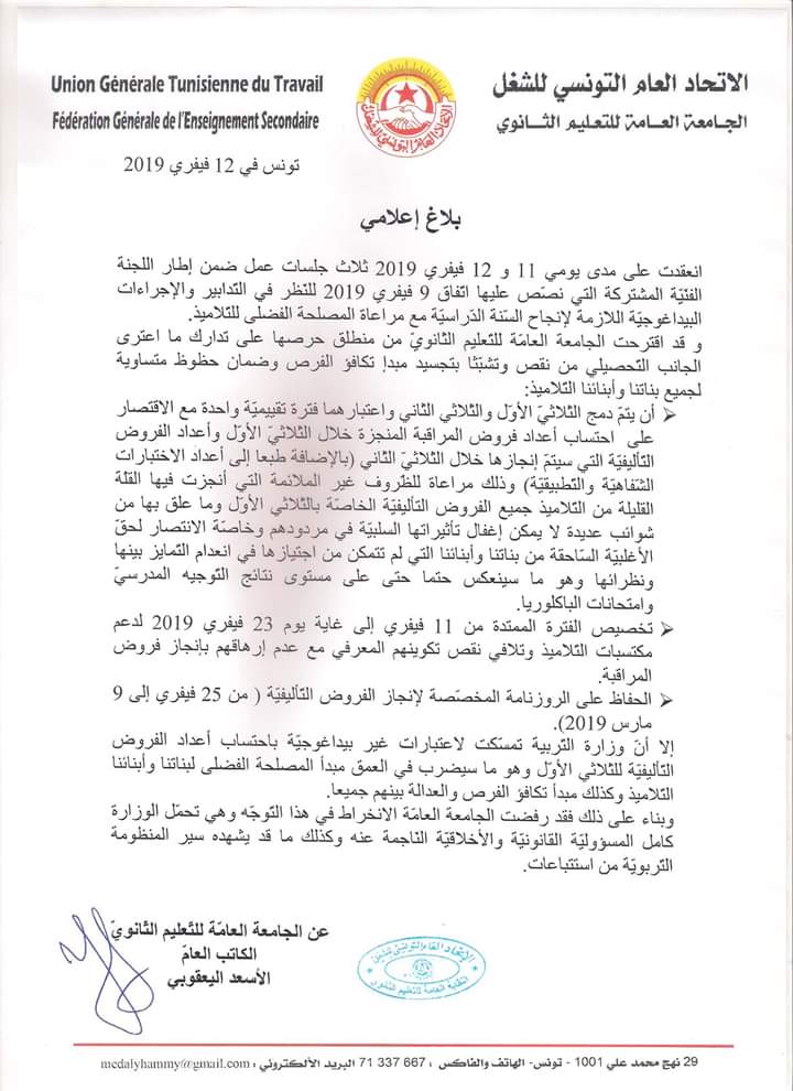 أكّدت الجامعة العامة للتعليم الثانوي، في بلاغ، رفضها مقترح وزارة التربية المتعلّق باحتساب أعداد الفروض التأليفية للثلاثي الأول في دمج الثلاثي الأول ولثاني واعتبارهما فترة تقييمية واحدة .