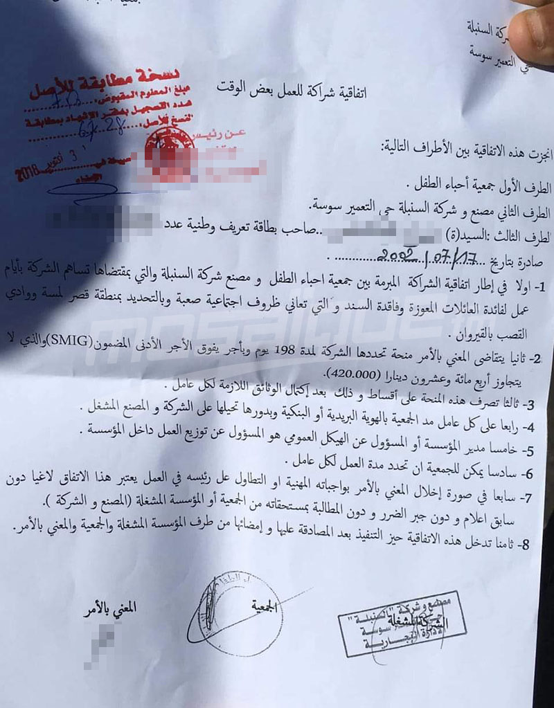 وأكّد عدد منهم لموزاييك بالجهة أنّهم أمضوا عقود عمل مقابل مبلغ 200 دينار عن كلّ عامل تسلّمه رئيس الجمعية، معبرين عن إستيائهم لعدم خلاصهم واصرارهم على تتبع الجمعية محملين المسؤولية للدولة باعتبارهم عملوا بمؤسساتها.