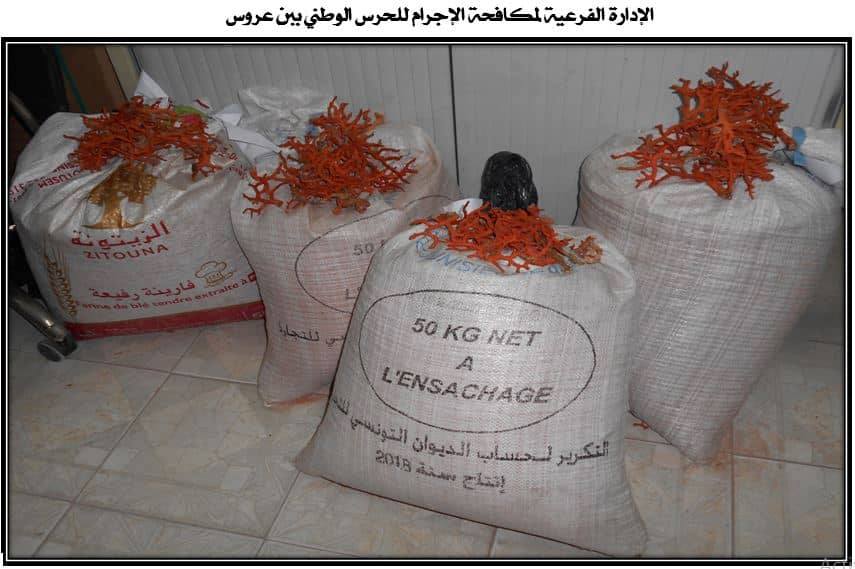 تمكّنت الفرقة الثالثة التّابعة للادارة الفرعيّة لمكافحة الاجرام بادارة الشّؤون العدليّة للحرس الوطني من إماطة اللثام عن شبكة تنشط في مجال تهريب مادّة المرجان خارج الأطر القانونيّة بين ولايات جندوبة - بنزرت - تونس وحجز كميّة من المرجان تقدّر بـ 671 كلغ تبلغ قيمتها 6.7 مليون دينار  وحجز 4 سيّارات ومبالغ ماليّة متفاوتة من العملة التّونسيّة والأجنبيّة.
