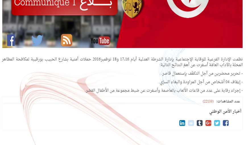 ووفق البلاغ ذاته، فقد نظمت الإدارة الفرعية للوقاية الاجتماعية بإدارة الشرطة العدلية أيام 16 و17 و18 نوفمبر2016 حملات أمنية أسفرت عن تحرير محضرين من أجل التكفّف باستعمال قاصر و إيقاف 4 أشخاص من أجل المراودة والبغاء السرّي، إضافة إلى إجراء رقابة على عدد من قاعات الألعاب بالعاصمة وأسفرت عن ضبط مجموعة من الأطفال القصّر.