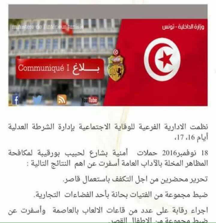 أعلنت وزارة الداخلية في بلاغ لها مساء اليوم الخميس 24 نوفمبر 2016، عن "ضبط مجموعة من الفتيات بحانة بأحد الفضاءات التجارية" ضمن "حملات أمنية بشارع الحبيب بورقيبة لمكافحة المظاهر المخلة بالآداب العامّة".