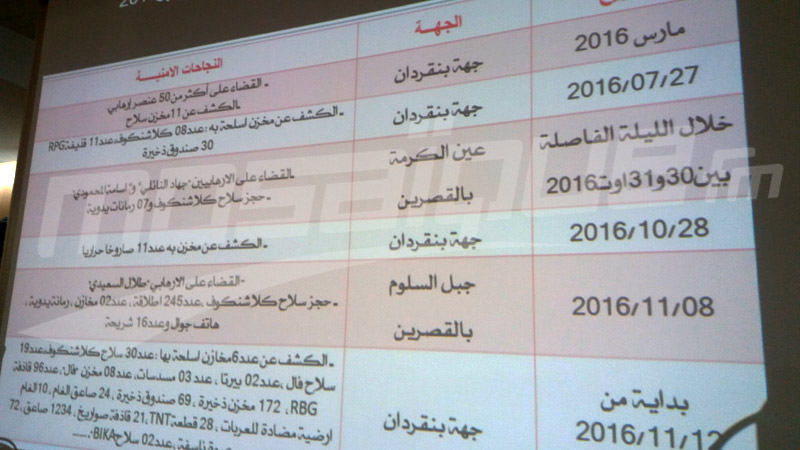 وفي سياق متّصل، أعلن المتحدث باسم الإدارة العامة للأمن الوطني العقيد وليد حكيمة أنّ وحدات الأمن الوطني تمكنت خلال الفترة من جانفي 2016 إلى موفى أكتوبر 2016 من القضاء على أكثر من 53 إرهابيا خمسون منهم في عملية شهر مارس في بن قردان، كما تمكنت خلال الفترة ذاتها من الكشف عن 19 مخبئا للأسلحة والذخيرة.
