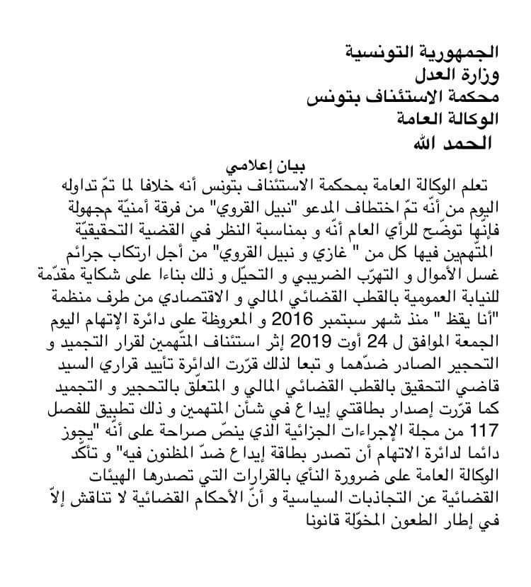 أكدت الوكالة العامة بمحكمة الاستئناف بتونس أنّه خلافا لما تم تداوله من أنه تم اختطاف "المدعو نبيل القروي" من قبل فرقة أمنية مجهولة، فان إلقاء القبض عليه يأتي بعد النظر في القضية التحقيقية المتهم فيها الأخوين القروي من أجل ارتكاب جرائم غسل الأموال والتهرب الضريبي والتحيل بناء على شكاية مقدّمة من قبل منظمة ''أنا يقظ''.