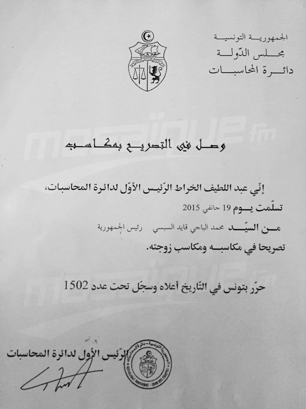 وتحصلت موزاييك على وثيقة تضمنت تصريحا بمكتسبات رئيس الجمهورية الباجي قائد السبسي تم إيداعها لدى دائرة المحاسبات.