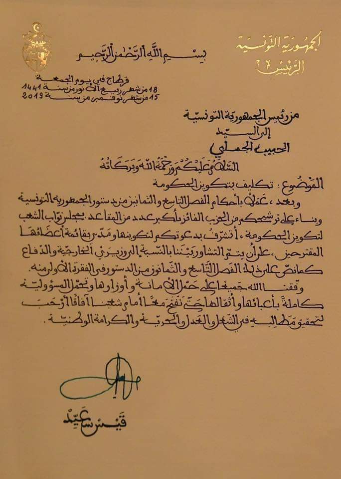 سلّم رئيس الجمهورية قيس سعيّد، اليوم الجمعة 15 نوفمبر 2019 الحبيب الجملي المرشّح لمنصب رئيس الحكومة رسالة تكليف لتشكيل الحكومة الجديدة.