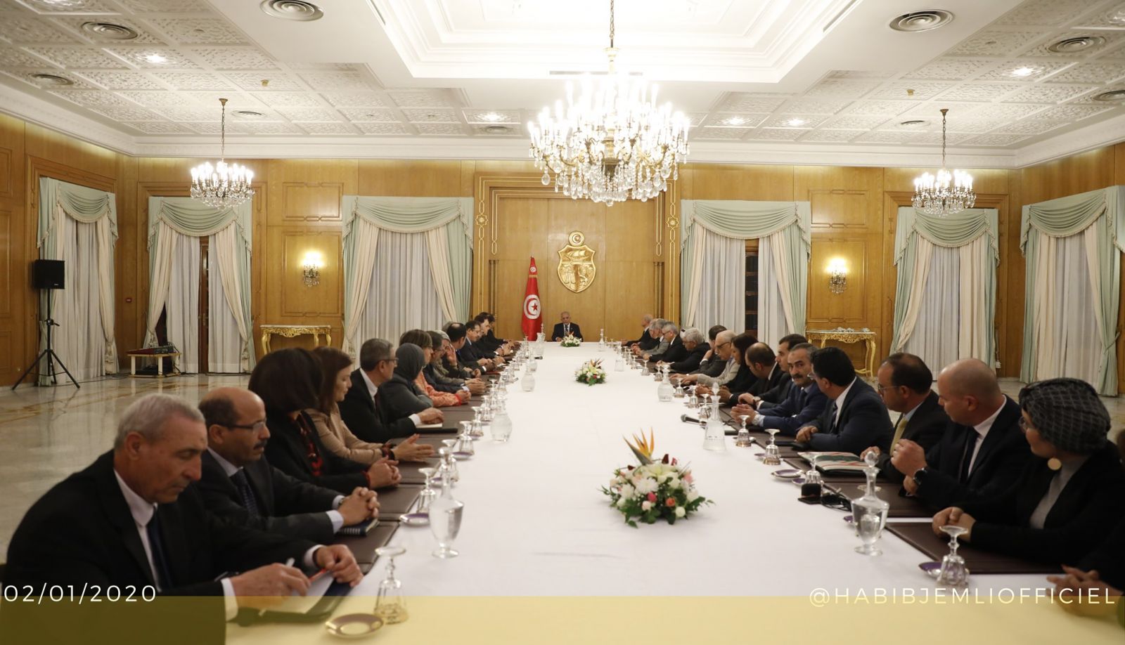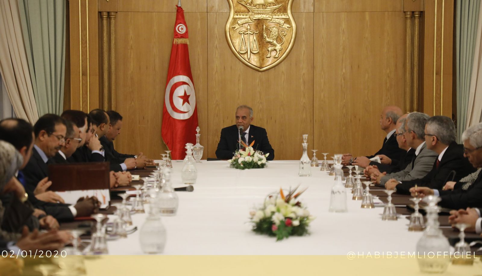 عقد رئيس الحكومة المكلف الحبيب جملي بدار الضيافة بقرطاج جلسة عمل مع كامل أعضاء الحكومة المقترحين لتقديمهم والتعارف بينهم.