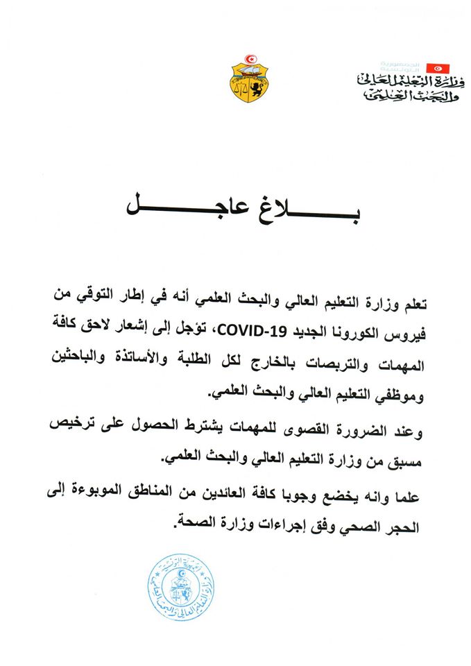 أعلنت وزارة التعليم والبحث العلمي تأجيل كافة المهمات والتربصات بالخارج لكل الطلبة والأساتذة والباحثين وموظفي التعليم العالي والبحث العلمي إلى إشعار آخر.