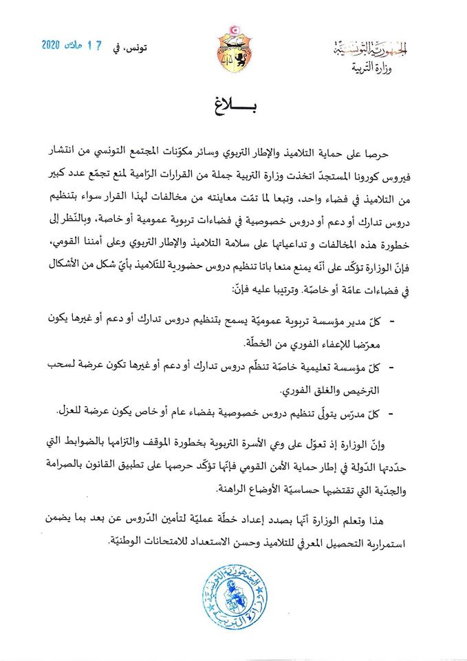 أكّدت وزارة التربية في بلاغ اليوم الثلاثاء 17 مارس 2020، أن كل مدير مؤسسة تربوية عمومية يسمح بتنظيم دروس تدارك أو دعم أو غيرها يكون معرضا للاعفاء الفوري من الخطة.