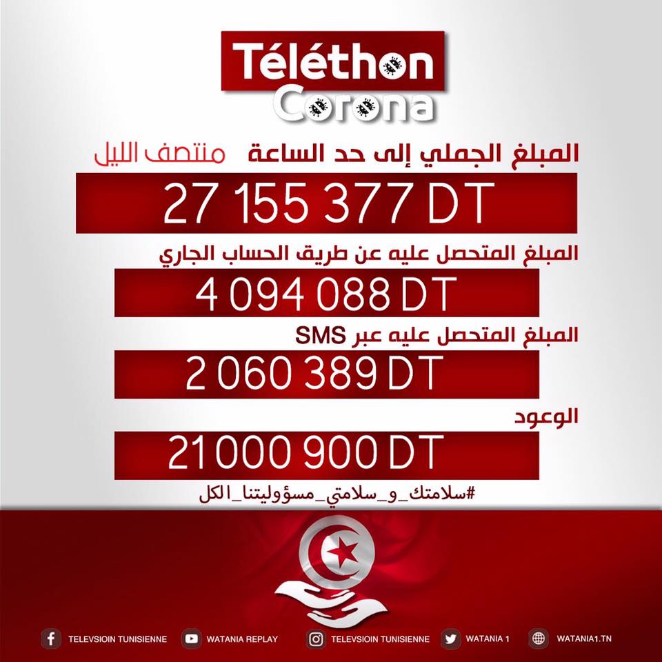 وبلغت قيمة التبرعات لفائدة الصندوق 1818 لمقاومة وباء ''كورونا'' المستجد إلى حدود منتصف الليل 27155377 مليون دينار، وزّعت كما يلي:
